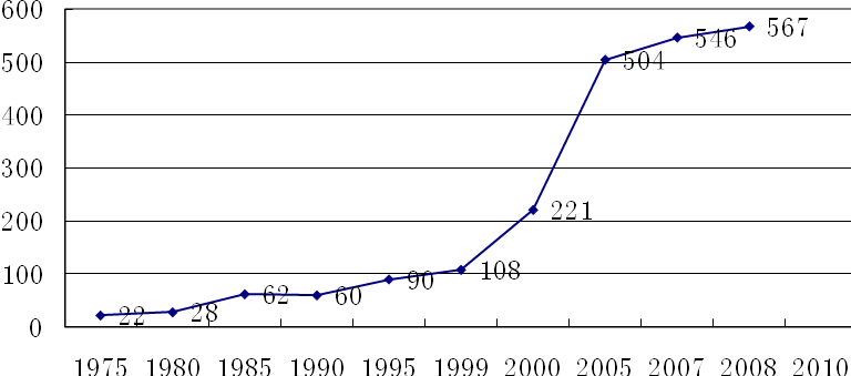 1999年初,教育部制定颁布了《面向21世纪教育振兴计划》,该计划提出要扩大高等教育规模,并最终实现于2010年同龄人口高等教育入学率接近15%的目标。在此背景下,截至到2007年底,我国高校已进行了9次大规模招生:我国高校1998年普通高等学校本专生招生数为108.4万人,1999年的招生数上升至159.7万人,增幅高达47.3%,到2007年招生数为565.9万人,短短9年内,招生数以20.2%的年均增长率高速增长着。研究生招生人数也由1998年的7.25万增至2007年的41.86万,年均增长率为21.5%。而在校生规模则由1998年的340.9万人上升至2007年的1884.9万人,年增长率为20.9%。连续的大规模招生,给高校正常的教学工作带来了前所未有的巨大压力和挑战。3