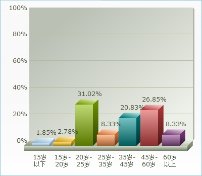在我们随机的调查中男性有95人占总比例的43.98%,女性121人占总比例的56.02%。如图1所示,其年龄在15岁以下的为1.85%,15岁—20岁之间的人数占总比的2.78%,20岁—25岁之间的人数为1.02%,25岁—35岁之间的人数为8.33%,35岁—45岁之间的人数为0.83%,45岁—60岁之间的人数6.85%,其中60岁以上的人数占8.33%。