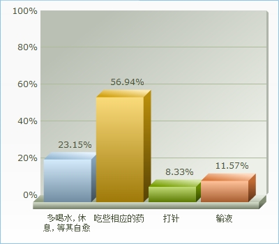 如图3所示,其中多喝水,休息,等其自愈的人数占总比例的23.15%,还有56.94%的人是感觉吃一些人是吃些相应的药就能可以了,8.33%的人是选择打针,11.57%的人是选择输液。