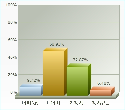 如图所示4所示,对于输液时间在1小时以内的人数占总比例的9.72%,1—2小时之间的为50.93%,2—3小时之间的为32.87%,3小时以上的为6.48%。45.83%的人在输液的时候是家人、亲属陪同的,15.28%是朋友、同事陪同的,但是也有38.89%人是自己一个人。