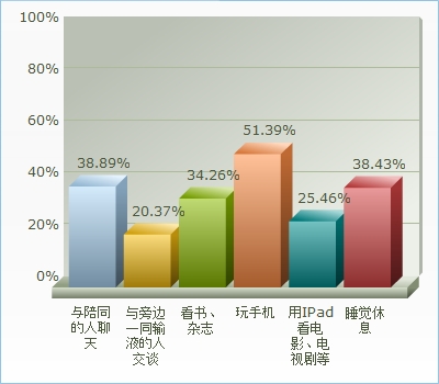 在本次调查中如图5所示,输液过程中以何种方式度过输液的时间,选择与陪同的人聊天的占总比例的38.89%,与旁边一同输液的人交谈的占总比例的20.37%,34.26%的人是选择看书、杂志,51.39%的人是选择玩手机,25.46%的人是选择用IPAD看电影、电视剧等,还有38.43%的人是选择在输液的时候睡觉休息。