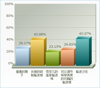 如图6所示,普通的凳子的为29.17%,并排的钢制输液椅的为43.98%,带茶几的高背输液椅的为23.15%,可以调节椅背高度的可躺的输液椅的为26.85%,输液沙发的为45.37%。