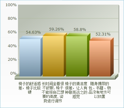如图7所示,椅子的舒适感差,椅子比较硬的占总比例的54.63%,长时间坐着很不舒服,椅子不能按自己想要的高度、姿势进行调节的占总比例的59.26%,椅子的清洁度很差,让人有种敬而远之的感觉的为58.8%,随身携带的包、书籍、物品没有地方可以放置的为52.31%。