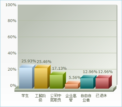 如图2所示,在这些调查的人数中有来自各种职业的,比如学生占25.93%,工薪阶段的为25.46%,公司中层职员为17.13%,企业高管的为5.56%,自由自业者和已退休的人数为12.96%。