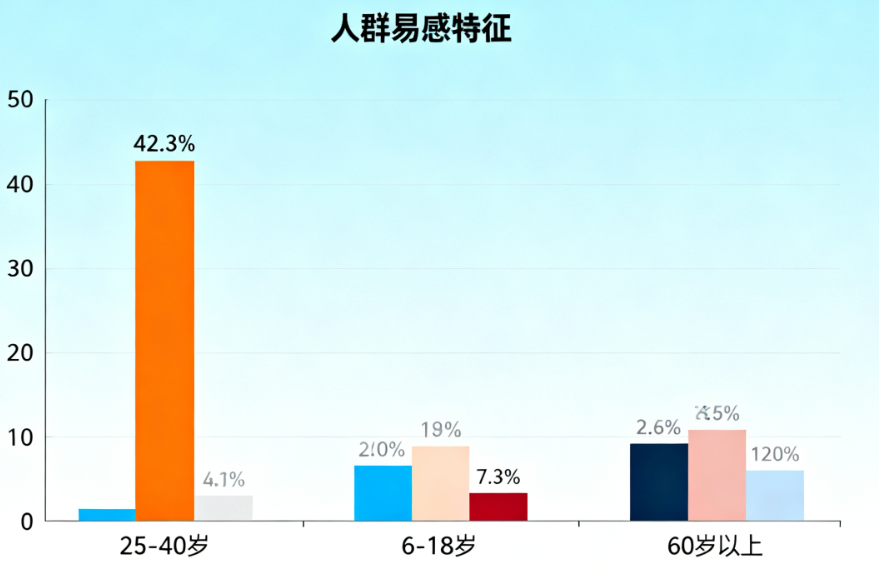 从年龄分布看,25-40 岁中青年群体感冒发生率高,占比达 42.3%,主要因职场压力大、熬夜频率高(每周 3 次及以上熬夜者占该群体 61.5%)、免疫力下降;其次为 6-18 岁学生群体,发生率 31.7%,校园密集环境与秋季开学后作息调整是主要诱因;而 60 岁以上老年群体因居家时间长、防护意识强,发生率仅 15.2%。