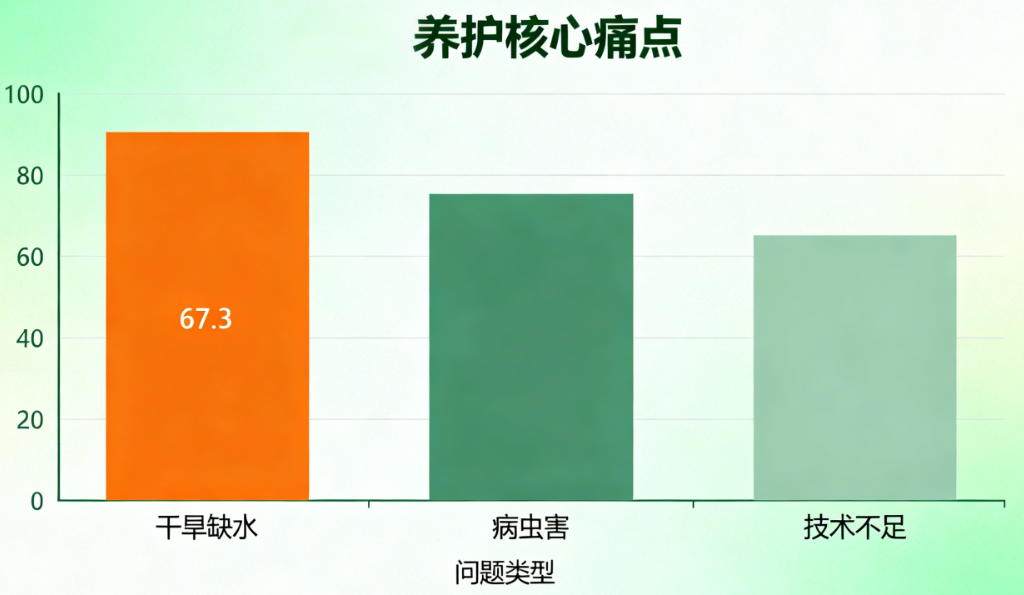(一)管养痛点:干旱与病虫害成首要难题,专业技术缺口显著