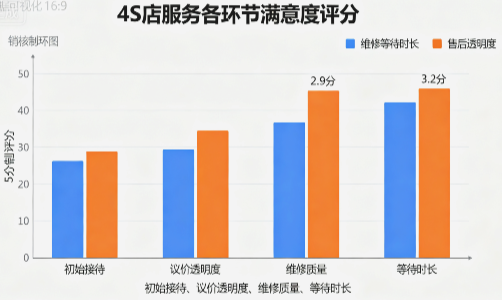 各环节满意度差异:销售环节中,初始接待热情度评分达 4.1 分,但议价过程透明度(3.2 分)和个性化需求满足度(3.3 分)偏低;售后环节里,维修质量(4.0 分)获认可,但维修等待时长(2.9 分)和预约兑现率(3.1 分)成为主要痛点;交车与售后跟踪环节,车辆清洁与文件完整性(3.9 分)表现较好,而模板化回访(3.0 分)和投诉处理响应速度(3.0 分)满意度不足。