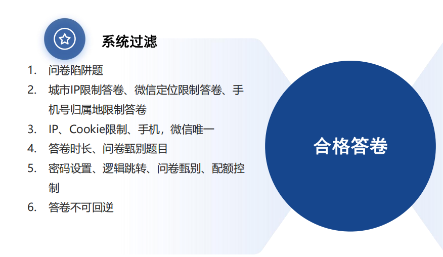 • 系统自动质量控制:如防重答卷、不认真答卷、故意乱答等。