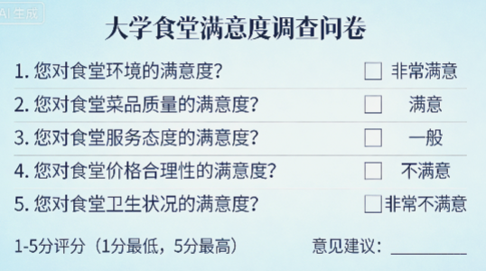 综上,按“基础信息+核心满意度+建议需求+结尾致谢”的结构,遵循三大原则、规避常见误区,就能设计出一份科学有效的大学食堂满意度调查问卷,快速收集师生意见,为食堂服务优化提供数据支撑。
