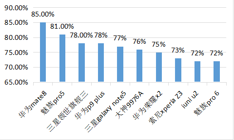 除此之外,三星galaxy note5(77%),大神9976A(76%),华为荣耀X2(75%)的好评数据都是比较接近的,其竞争也是比较激烈的。索尼xperia z3(73%),iuni u2(72%),魅族pro 6(72%),在这些好评中还存在一些小差距,还需要继续努力。