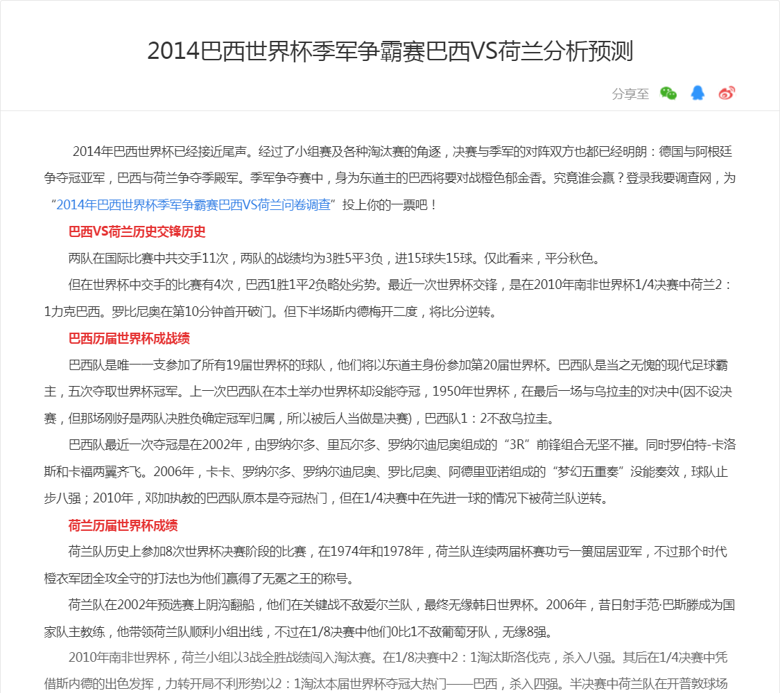 2014巴西世界杯季军争霸赛巴西VS荷兰分析预测