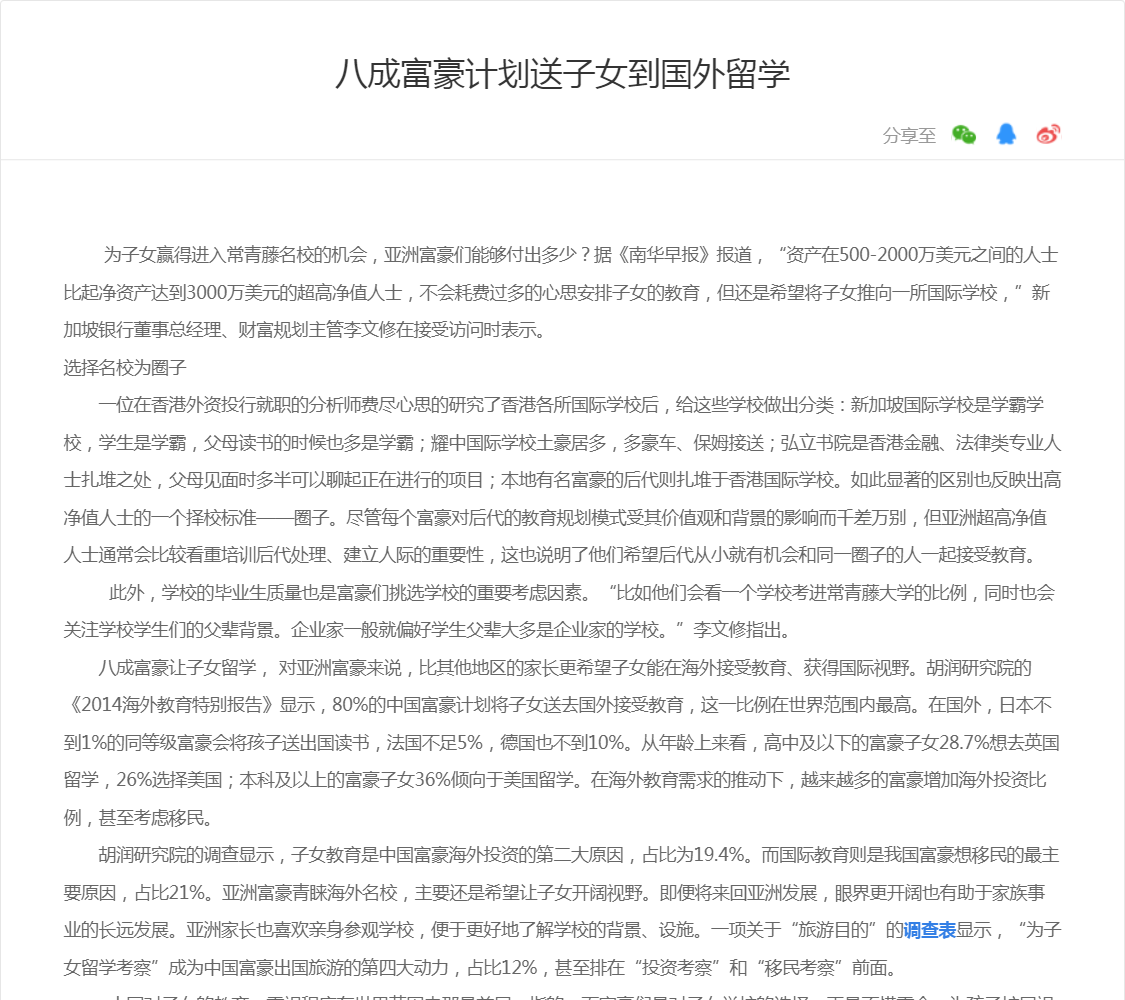 八成富豪计划送子女到国外留学
