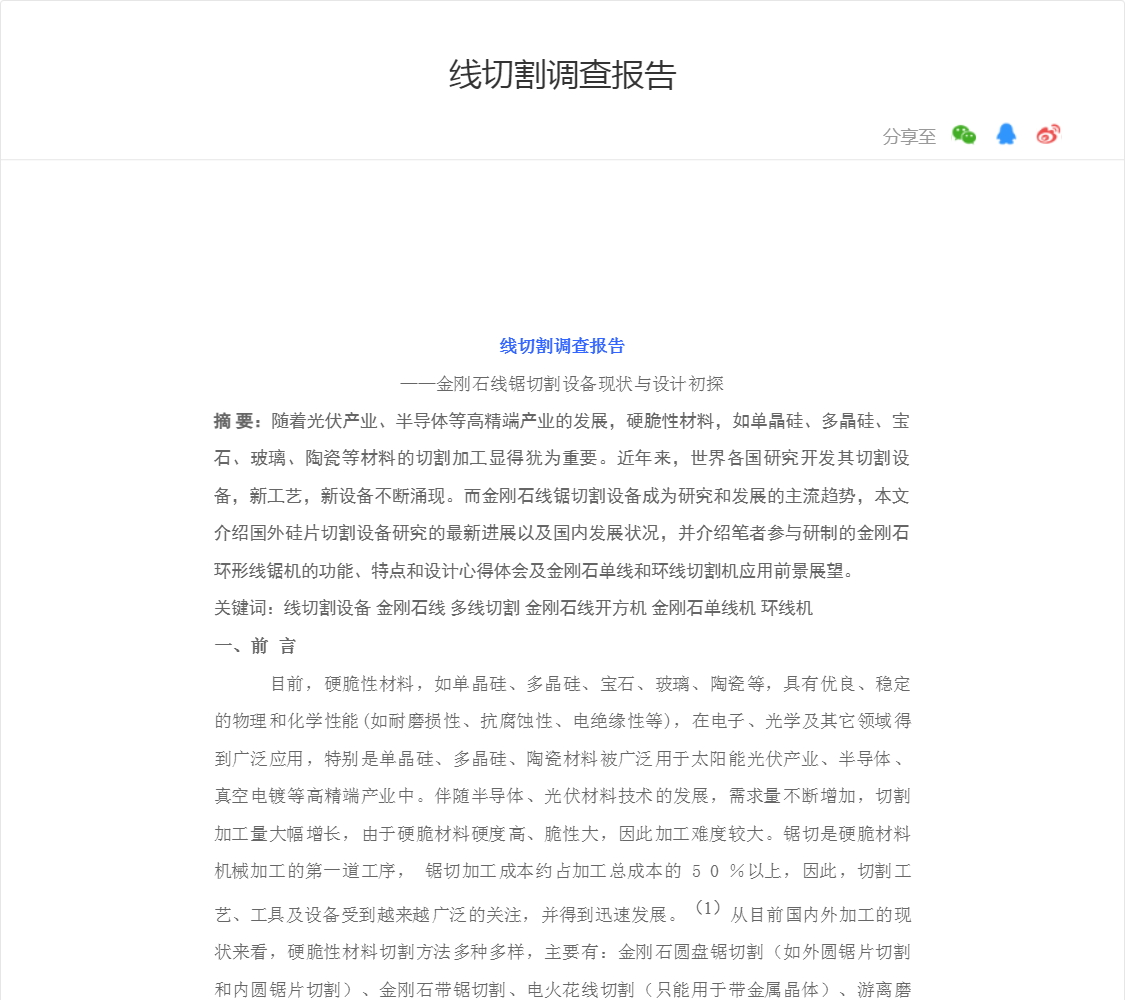 随着光伏产业、半导体等高精端产业的发展,硬脆性材料,如单晶硅、多晶硅、宝石、玻璃、陶瓷等材料的切割加工显得犹为重要。近年来,世界各国研究开发其切割设备,新工艺,新设备不断涌现。而金刚石线锯切割设备...