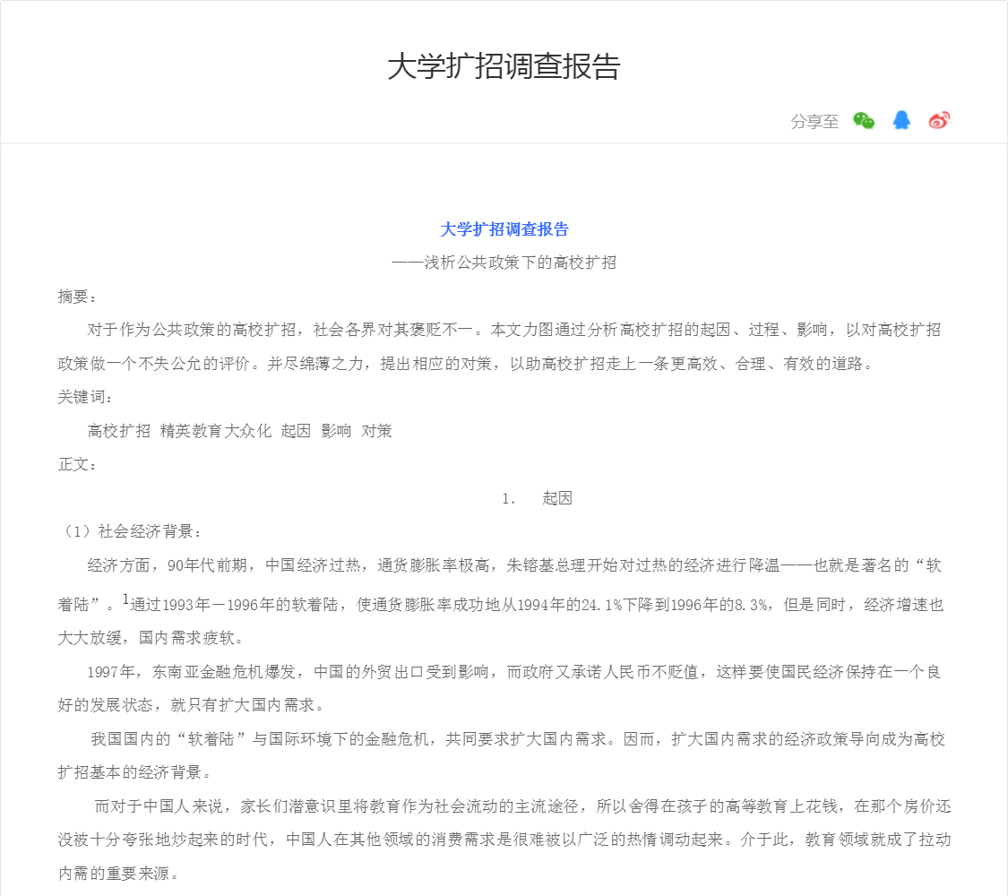 对于作为公共政策的高校扩招,社会各界对其褒贬不一。本文力图通过分析高校扩招的起因、过程、影响,以对高校扩招政策做一个不失公允的评价。并尽绵薄之力,提出相应的对策,以助高校扩招走上一条更高效、合理、有效的道路。