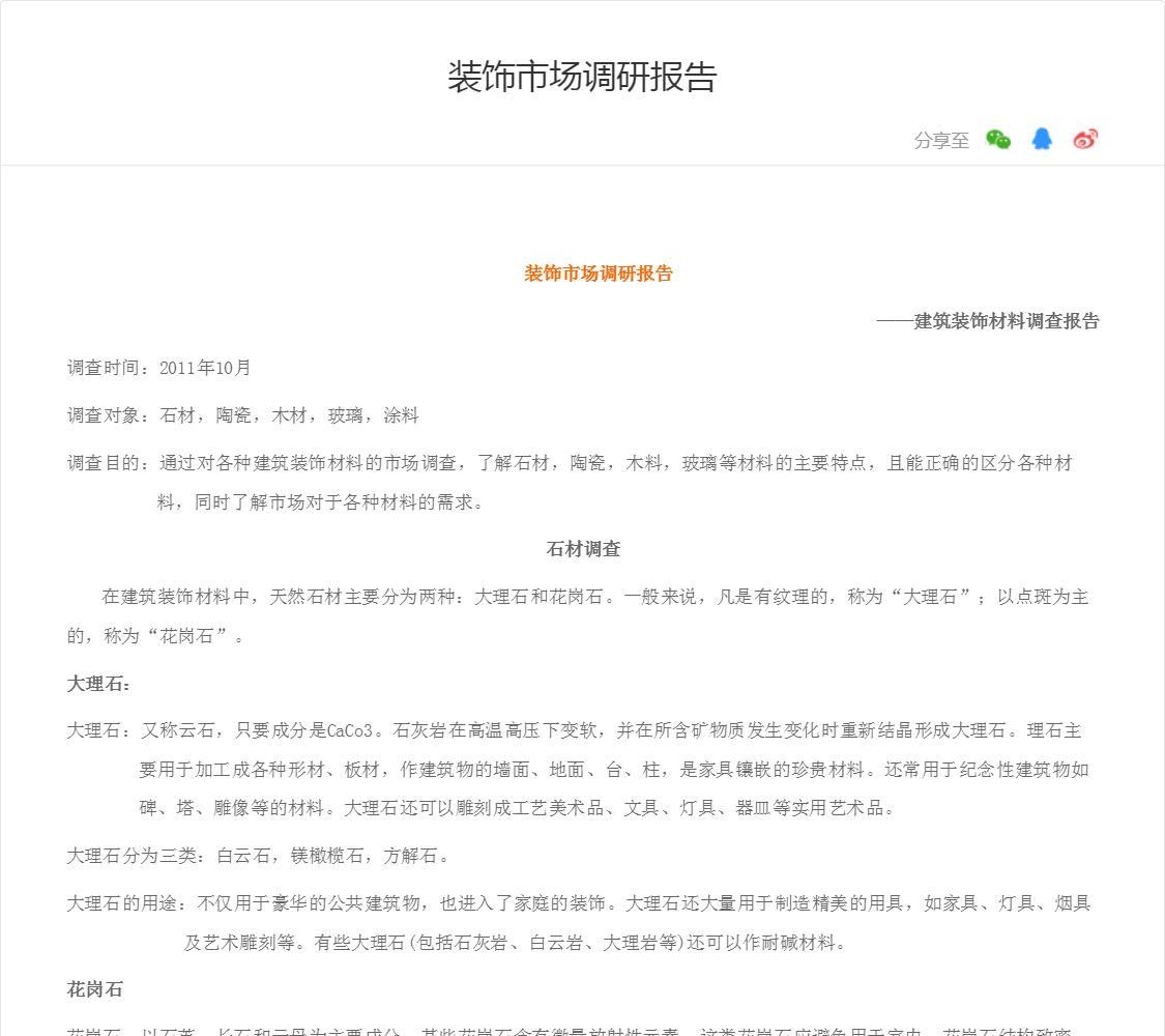 调查目的:通过对各种建筑装饰材料的市场调查,了解石材,陶瓷,木料,玻璃等材料的主要特点,且能正确的区分各种材料,同时了解市场对于各种材料的需求。