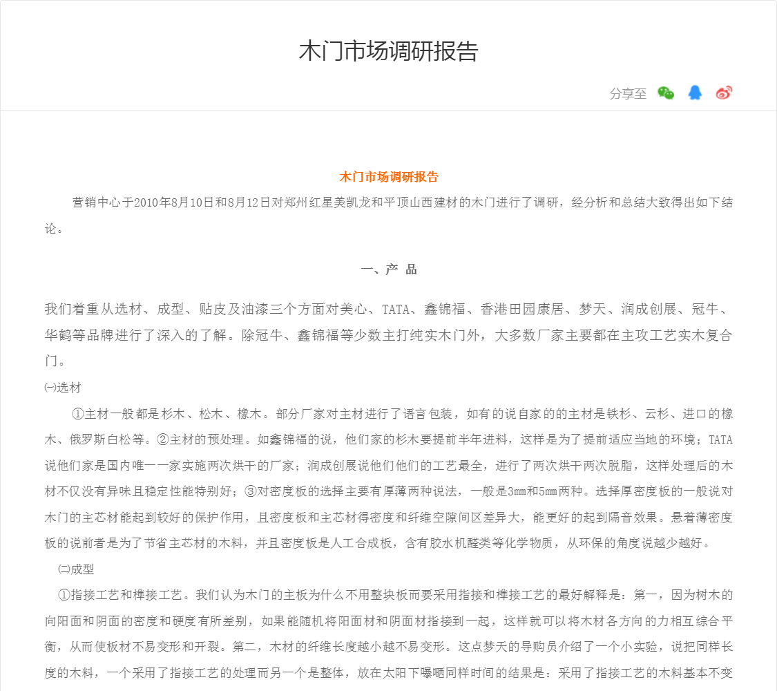 营销中心于2010年8月10日和8月12日对郑州红星美凯龙和平顶山西建材的木门进行了调研,经分析和总结大致得出如下结论。