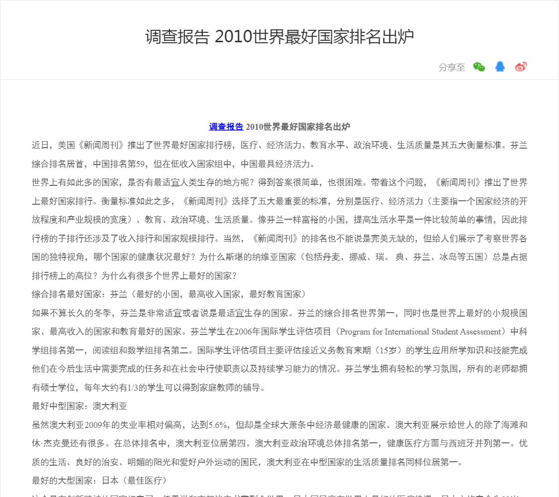 近日,美国《新闻周刊》推出了世界最好国家排行榜,医疗、经济活力、教育水平、政治环境、生活质量是其五大衡量标准。芬兰综合排名居首,中国排名第59,但在低收入国家组中,中国最具经济活力。