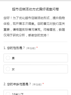 您好!为了优化超市促销活动形式,提升购物体验,现开展本次调查。您的意见对我们至关重要,请根据实际情况填写。问卷匿名,数据仅用于研究分析,感谢您的支持!