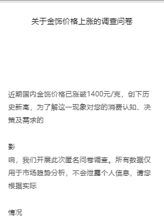 近期国内金饰价格已涨破1400元/克,创下历史新高,为了解这一现象对您的消费认知、决策及需求的 影 响,我们开展此次匿名问卷调查。所有数据仅用于市场趋势分析,不会泄露个人信息,请您根据实际 情况 作答,感谢您的支持与配合!