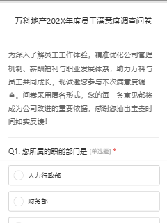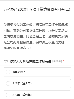为深入了解员工工作体验,精准优化公司管理机制、薪酬福利与职业发展体系,助力万科与员工共同成长,现诚邀您参与本次满意度调查。问卷采用匿名形式,您的每一条意见都将成为公司改进的重要依据,感谢您抽出宝贵时间如实反馈!