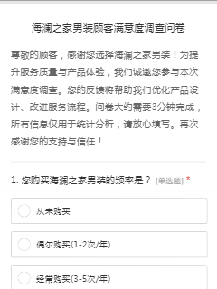 尊敬的顾客,感谢您选择海澜之家男装!为提升服务质量与产品体验,我们诚邀您参与本次满意度调查。您的反馈将帮助我们优化产品设计、改进服务流程。问卷大约需要3分钟完成,所有信息仅用于统计分析,请放心填写。再次感谢您的支持与信任!