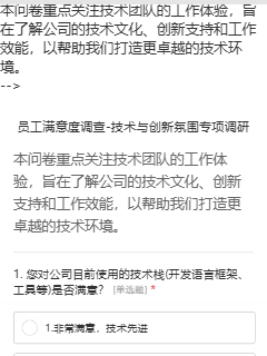 本问卷重点关注技术团队的工作体验,旨在了解公司的技术文化、创新支持和工作效能,以帮助我们打造更卓越的技术环境。