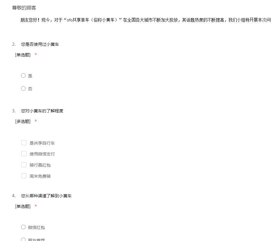 朋友您好!现今,对于“ofo共享单车(俗称小黄车)”在全国各大城市不断加大投放,其话题热度的不断提高,我们小组特开展本次问卷。希望如实填写,谢谢您的配合!