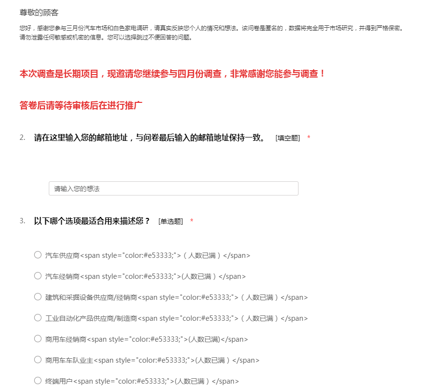 汽车供应商2017年4月市场调查问卷
