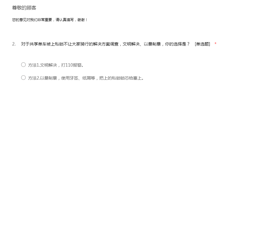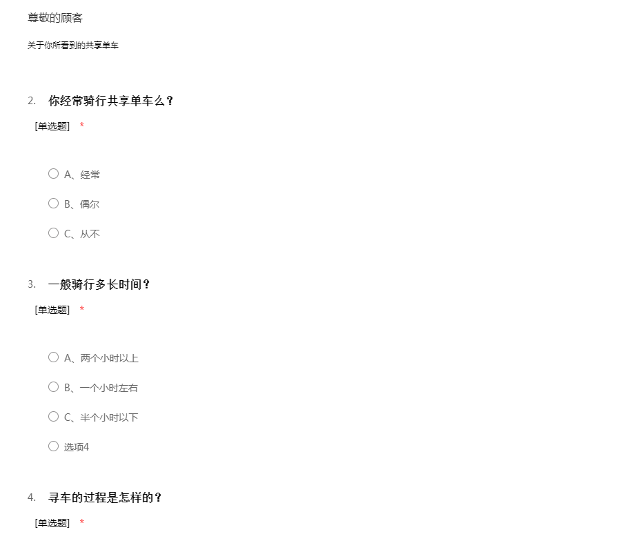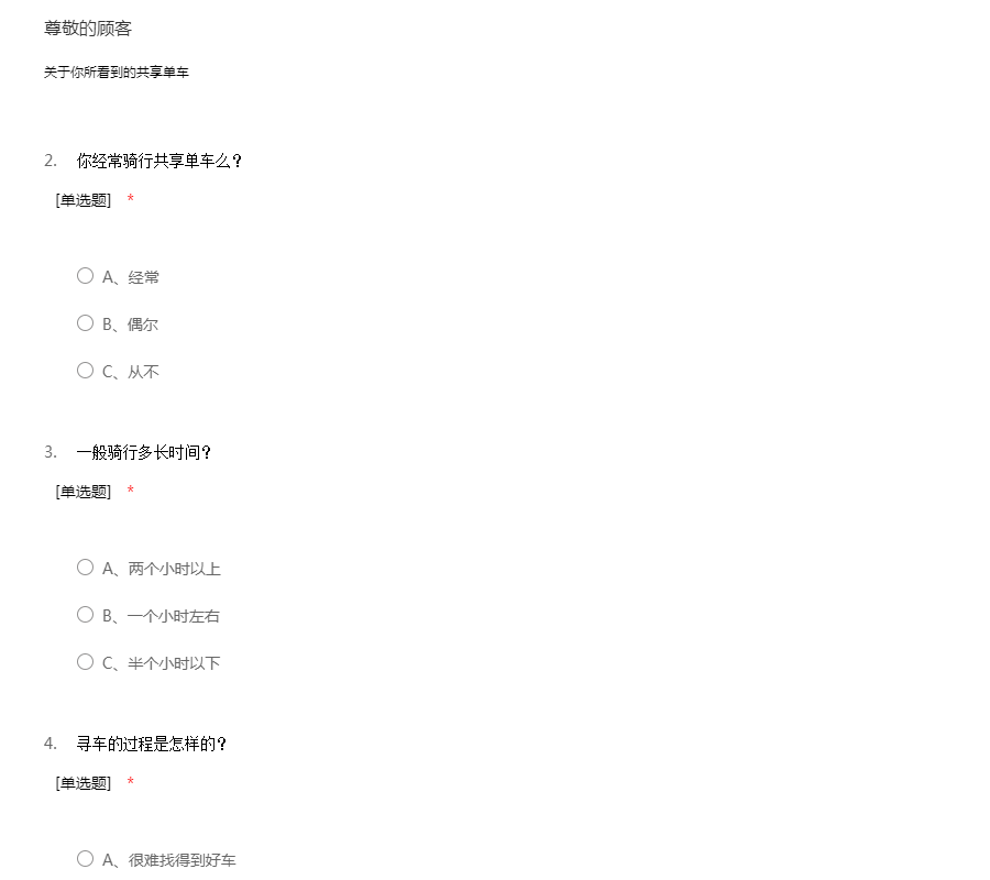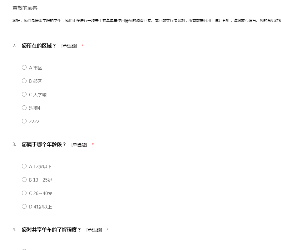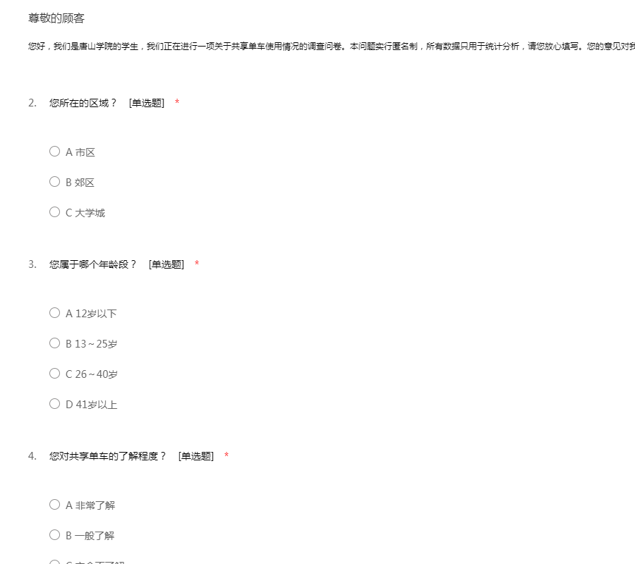 您好,我们是唐山学院的学生,我们正在进行一项关于共享单车使用情况的调查问卷。本问题实行匿名制,所有数据只用于统计分析,请您放心填写。您的意见对我们非常重要,请认真填写,谢谢!