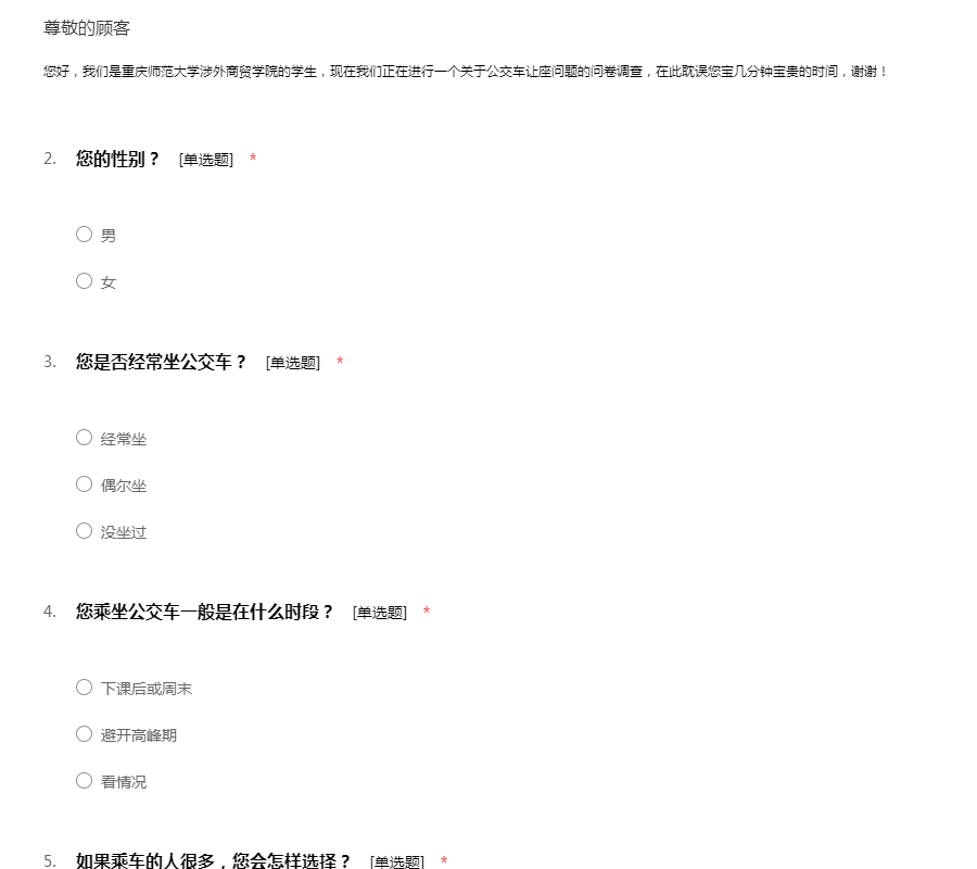 您好,我们是重庆师范大学涉外商贸学院的学生,现在我们正在进行一个关于公交车让座问题的问卷调查,在此耽误您宝几分钟宝贵的时间,谢谢!
