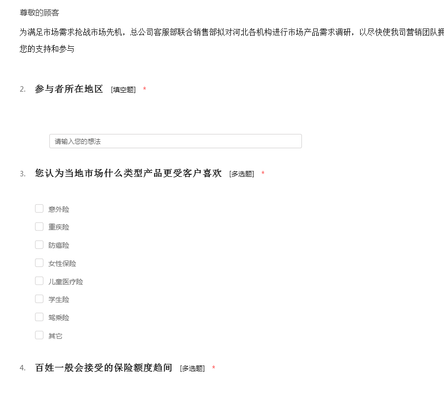 为满足市场需求抢战市场先机,总公司客服部联合销售部拟对河北各机构进行市场产品需求调研,以尽快使我司营销团队拥有更多具有竞争实力的产品,感谢您的支持和参与