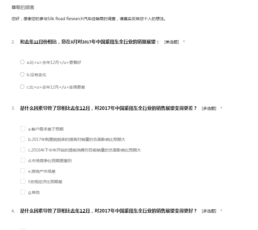 您好,感谢您的参与Silk Road Research汽车经销商的调查,请真实反映您个人的想法。