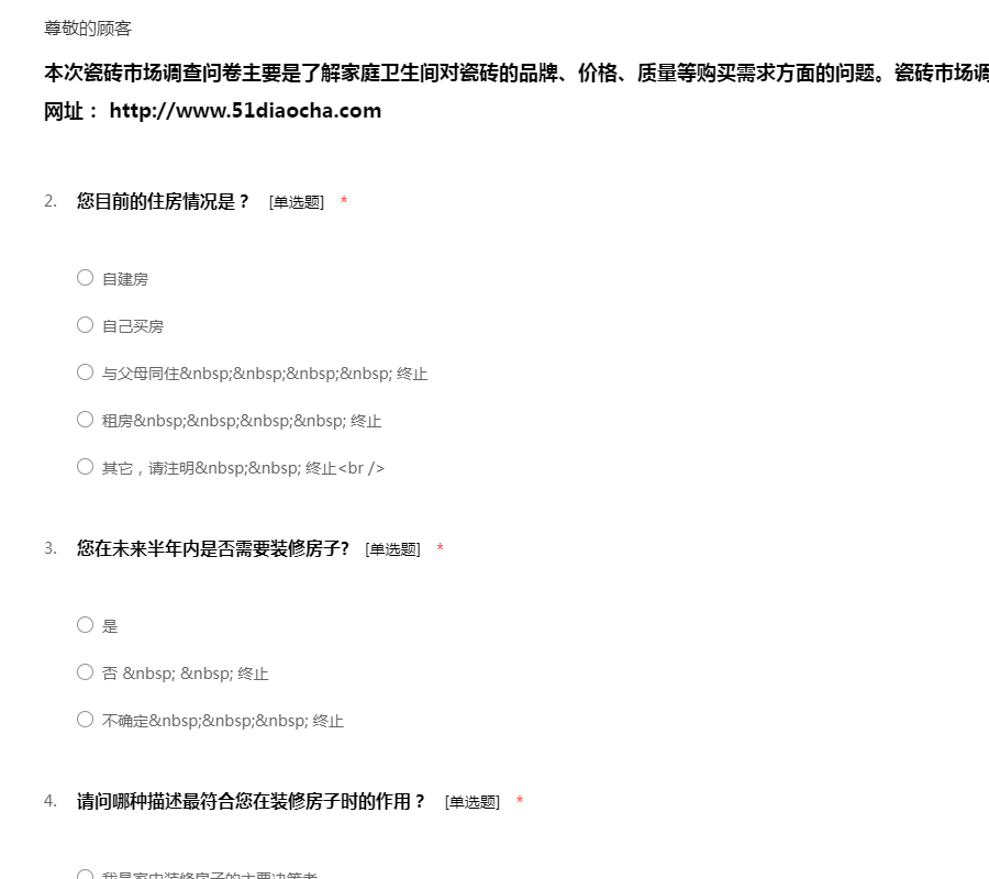 本次瓷砖行业消费者研究调查问卷主要是了解瓷砖的产品品牌、功效及市场满意度等方面的问题。瓷砖行业消费者研究调查问卷模板由我要调查网提供,网址: http://www.51diaocha.com
