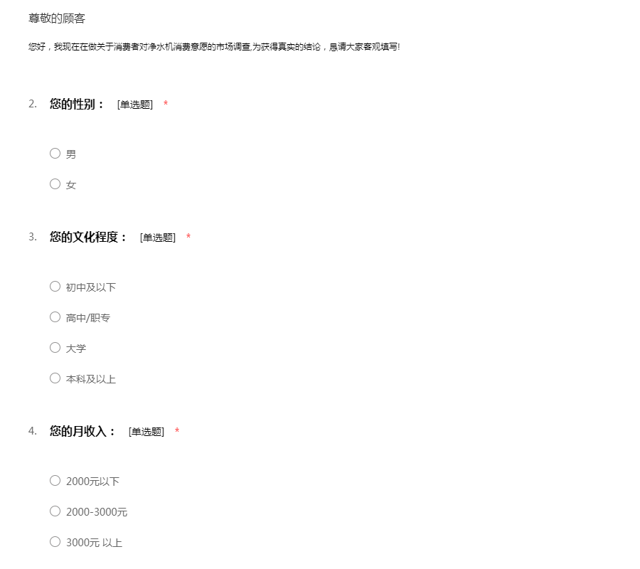 您好,我现在在做关于消费者对净水机消费意愿的市场调查,为获得真实的结论,恳请大家客观填写!