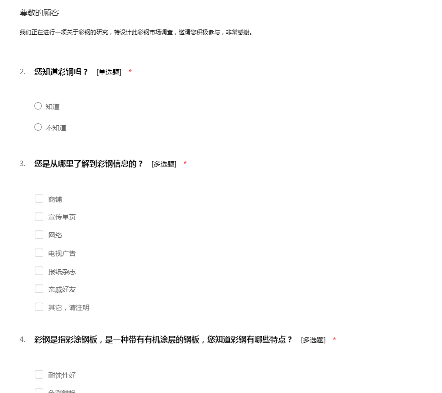 我们正在进行一项关于彩钢的研究,特设计此彩钢市场调查,邀请您积极参与,非常感谢。