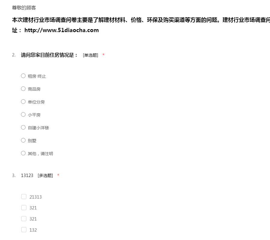 本次建材行业市场调查问卷主要是了解建材材料、价格、环保及购买渠道等方面的问题。建材行业市场调查问卷模板由我要调查网提供,网址: http://www.51diaocha.com