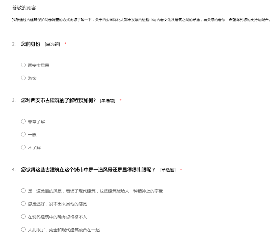 我想通过古建筑保护问卷调查的方式向您了解一下,关于西安国际化大都市发展的进程中与古老文化及建筑之间的矛盾,有关您的看法,希望得到您的支持与配合。谢谢您的合作!