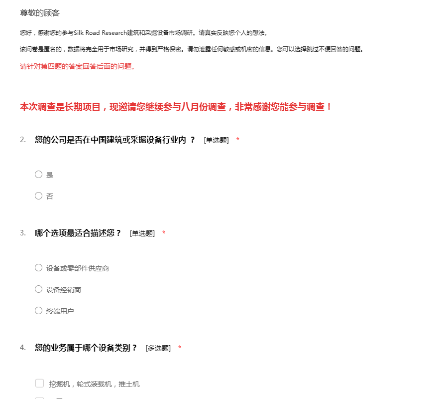 感谢您参与9月份的建筑与采掘市场的调查问卷,关于您的回答,我们有如下的跟进问题。
