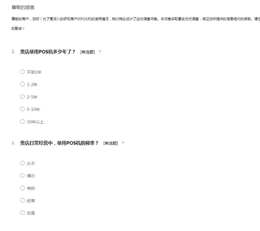 尊敬的商户,您好!为了更深入的研究商户对POS机的使用情况,我们特此设计了这份调查问卷。本问卷采取匿名方式调查,保证您所提供的信息绝对的保密。请您根据个人经历及感受,回答下面各问题。感谢您的配合!
