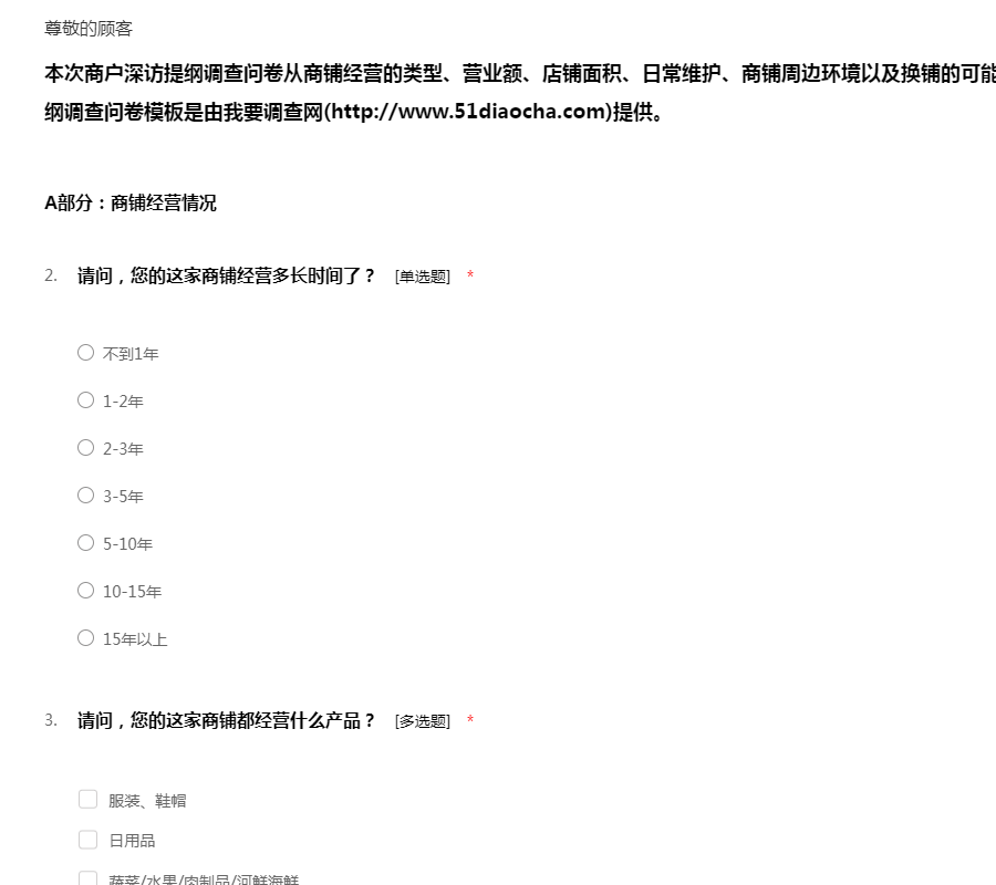 感谢您参与“商户调查问卷”,此问卷旨在了解关于商户们在市场经营过程中的相关情况,调查所得的结果对您的工作和生活不会带来任何不良影响,请您根据自己的实际情况放心填写,51调查网感谢您的配合!