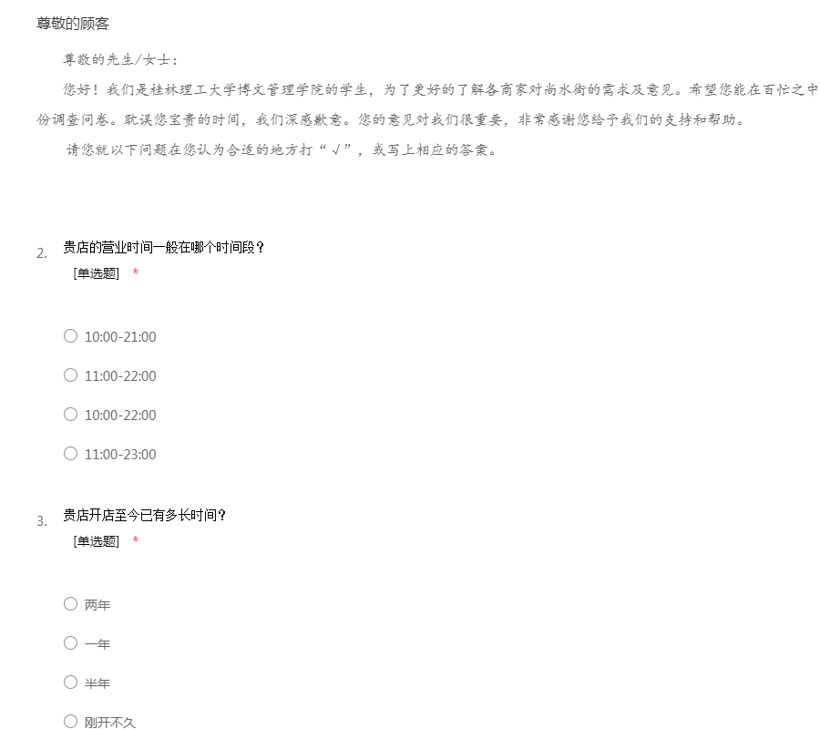 尊敬的先生/女士: 您好!我们是桂林理工大学博文管理学院的学生,为了更好的了解各商家对尚水街的需求及意见。希望您能在百忙之中抽出一些时间,协助我们完成以下这份调查问卷。耽误您宝贵的时间,我们深感歉意。您的意见对我们很重要,非常感谢您给予我们的支持和帮助。 请您就以下问题在您认为合适的地方打“√”,或写上相应的答案。