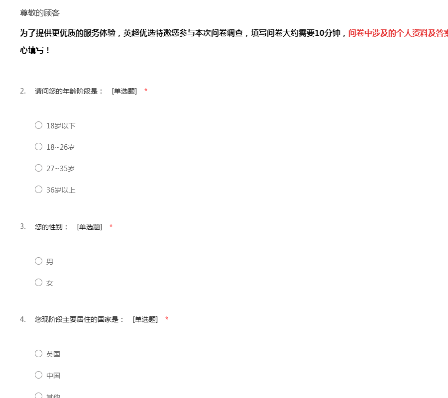为了提供更优质的服务体验,英超优选特邀您参与本次问卷调查,填写问卷大约需要10分钟,问卷中涉及的个人资料及答案我们都会做严格保密处理。请您放心填写!