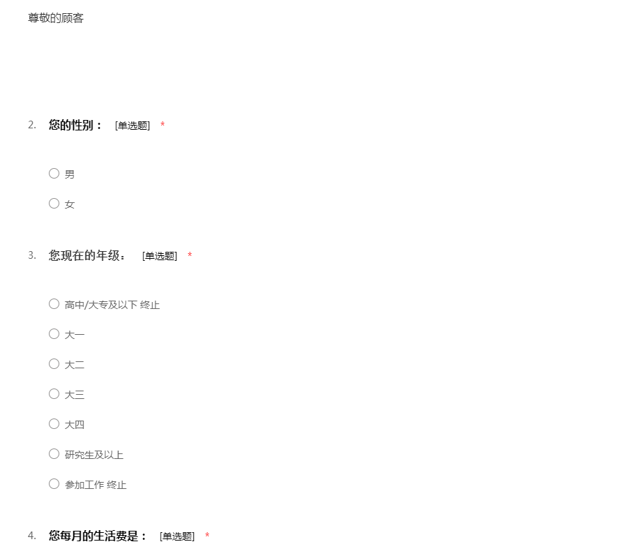 亲爱的同学:您好,我们正在完成一个作业,特进行本次问卷调查,请您提供宝贵意见,请您选择认为合适的选项,调查可能会耽误您3分钟左右的时 间,请您谅解,谢谢您的配合与支持。