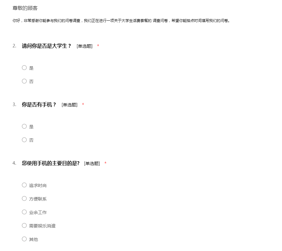 你好,非常感谢你能参与我们的问卷调查,我们正在进行一项关于大学生话费套餐的 调查问卷,希望你能抽点时间填写我们的问卷。