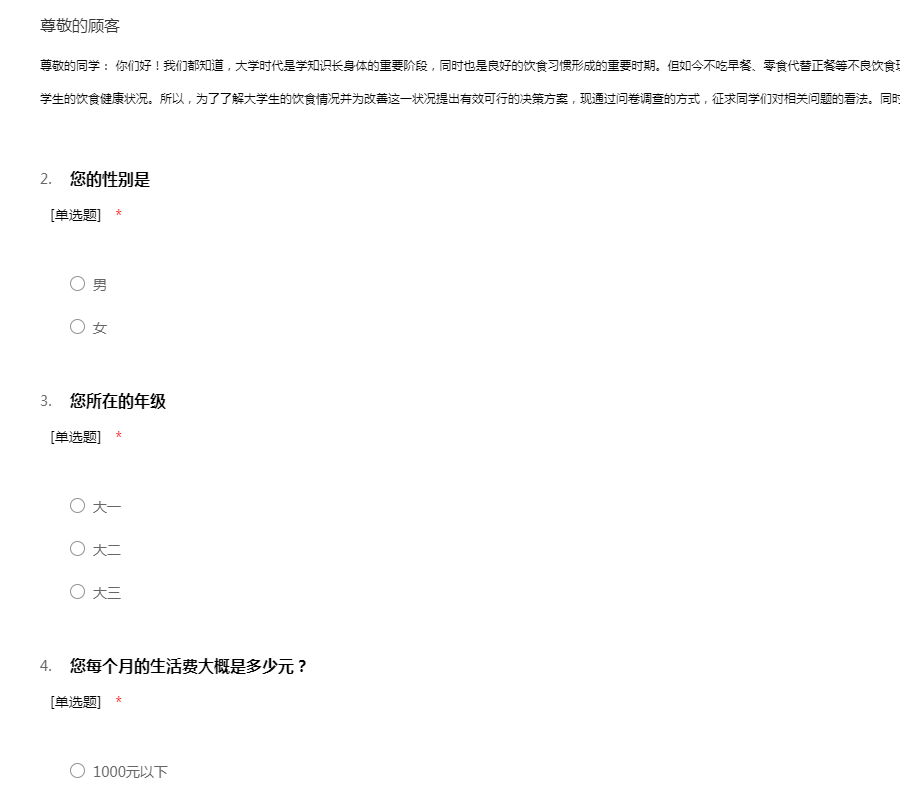 尊敬的同学: 你们好!我们都知道,大学时代是学知识长身体的重要阶段,同时也是良好的饮食习惯形成的重要时期。但如今不吃早餐、零食代替正餐等不良饮食现象的陆续出现,确实让我们不得不开始担忧大学生的饮食健康状况。所以,为了了解大学生的饮食情况并为改善这一状况提出有效可行的决策方案,现通过问卷调查的方式,征求同学们对相关问题的看法。同时也万分感谢大家的对我工作的支持!!谢谢!!
