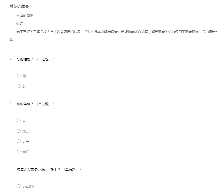 亲爱的同学: 您好! 为了更好的了解我校大学生饮食习惯的情况,我们进行本次问卷调查,希望您能认真填写,问卷调查的信息仅用于调查研究,我们承诺所有相关信息都将被严格保密,请放心回答。