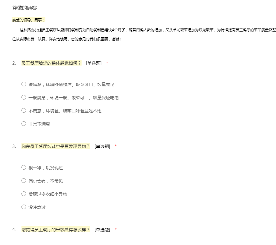 亲爱的领导、同事: 桂林路办公组员工餐厅从厨师打餐制变为自助餐制已经快4个月了,随着用餐人数的增加,又从单龙取菜增加为双龙取菜。为持续提高员工餐厅的菜品质量及整体就餐满意度,特开展此次不记名调研。烦请各位从实际出发,认真、详实地填写。您的意见对我们很重要,谢谢!