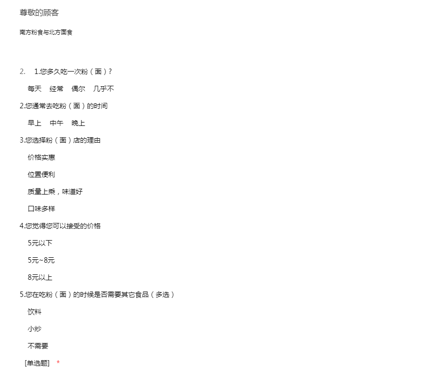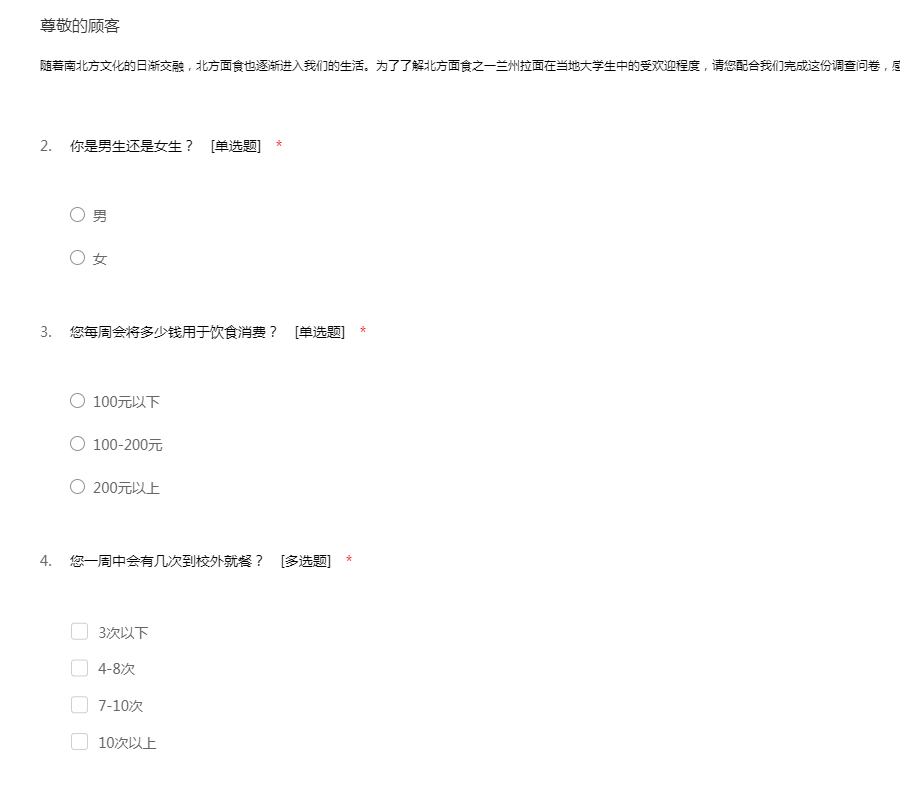 随着南北方文化的日渐交融,北方面食也逐渐进入我们的生活。为了了解北方面食之一兰州拉面在当地大学生中的受欢迎程度,请您配合我们完成这份调查问卷,感谢您的配合!