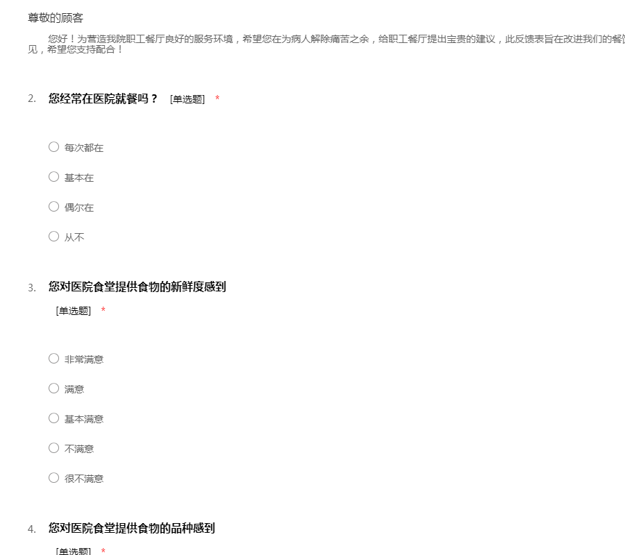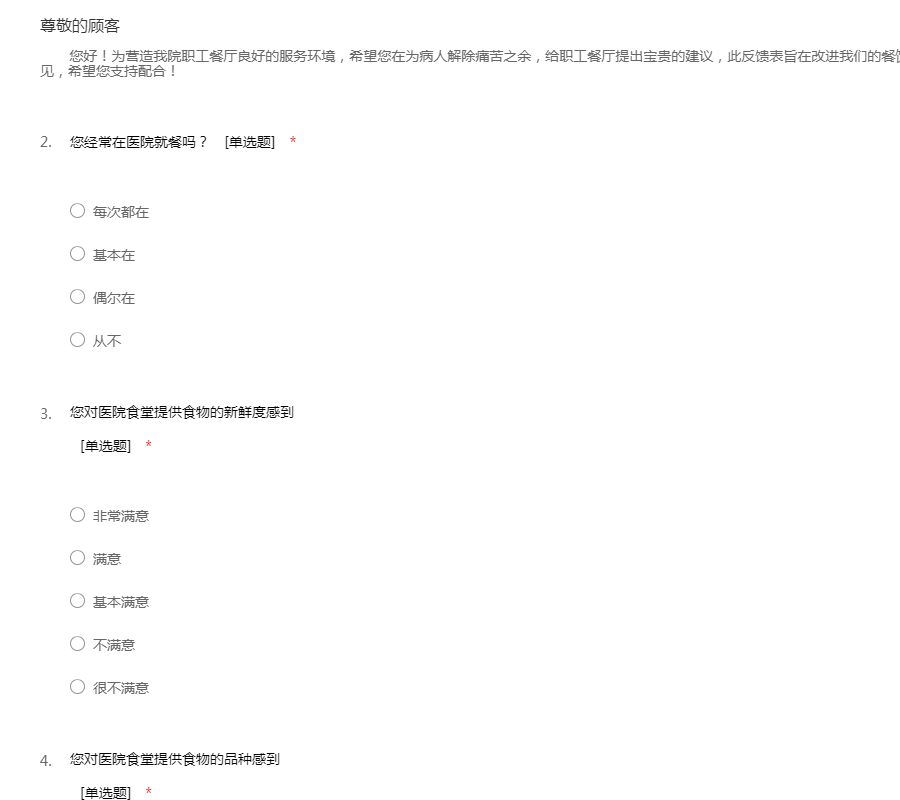 您好!为营造我院职工餐厅良好的服务环境,希望您在为病人解除痛苦之余,给职工餐厅提出宝贵的建议,此反馈表旨在改进我们的餐饮服务,因此,我们将加倍重视您的意见,希望您支持配合!