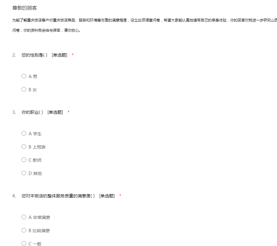 为能了解重庆饭店客户对重庆饭店菜品、服务和环境等方面的满意程度,设立此项调查问卷,希望大家能认真地填写自己的亲身体验,你的回答对我进一步研究山西大学小型餐馆的营销策略十分重要。感谢你填写问卷,你的资料我会给与保密,请你放心。
